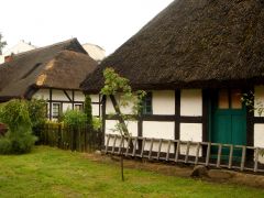 Najważniejszą częścią ekspozycji – zagrody rybackiej – jest chata, w której zgromadzono pochodzące z przełomu wieków XIX i XX eksponaty z Jamna oraz sąsiedniej wsi Łabusz. Wyposażenie wzbogacono przedmiotami pochodzącymi z pomorskich wsi, podobnymi do tych, które występowały również w Jamnie. Chata, jak inne budynki, zbudowana jest w konstrukcji ryglowej wypełnionej szachulcem – drewniane bale ułożone w kratownicę były wypełniane gliną zmieszaną z sieczką, trocinami czy wiórami, a następnie tynkowane; dachy zaś kryto trzciną. W chałupie znajdują się trzy izby, dwie komory, kuchnia, sień oraz chlewik. Co należy podkreślić, w trakcie przenoszenia budynku odtworzono jego usytuowanie względem stron świata i drogi wiejskiej. Dzięki temu widać, jak wpadało światło do izby i przez które okna mogli zaglądać sąsiedzi. Z kolei, w odremontowanej stodole, pochodzącej z 1882 roku, pierwotnie stojącej we wsi Paproty (oddalonej o około 25 km od Jamna), została otwarta w 2005 r. wystawa pt. „Dzieje kuźni pomorskiej”.
