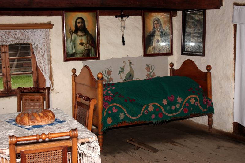 Wnętrze czarnej izby w chałupie ze wsi Antoniów z początku XIX wieku. Wyposażenie charakterystyczne dla zamożnej rodziny wiejskiego młynarza z końca XIX wieku. Na ścianie wiszą święte obrazy (oleodruki), a na uwagę zasługuję szczególnej urody haftowane narzuta i makatka.