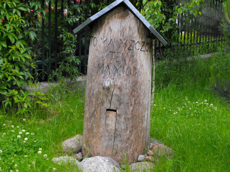 Ul kłodowy z wyrytym napisem "Kto ma pszczoły, ten na miód". Przez szczelinę w przedniej ścianie pszczoły mogą wchodzić do wnętrza.