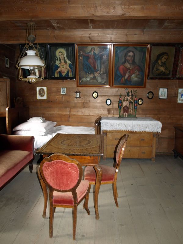 Wnętrze chałupy sołtysiej ze wsi Przeginia Duchowna z 1862 roku. Ekspozycja z oryginalnym wyposażeniem przedstawia życie zamożnych chłopów. Na zdjęciu izba reprezentacyjna z meblami wzorowanymi na dworskich. Na ścianie święte obrazy. Na szafce przy łóżku stoi rzeźba ludowa przedstawiająca chrzest Chrystusa w Jordanie. |