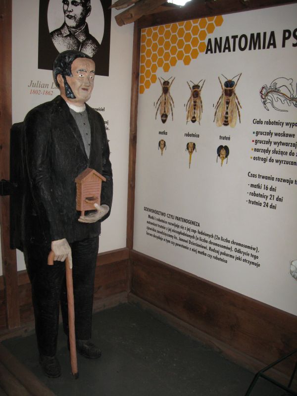 Ul figuralny przedstawiający Juliana Lubienieckiego w Skansenie i Muzeum Pszczelarstwa w Swarzędzu. Ul polichromowany z jednego kawałka drewna.
