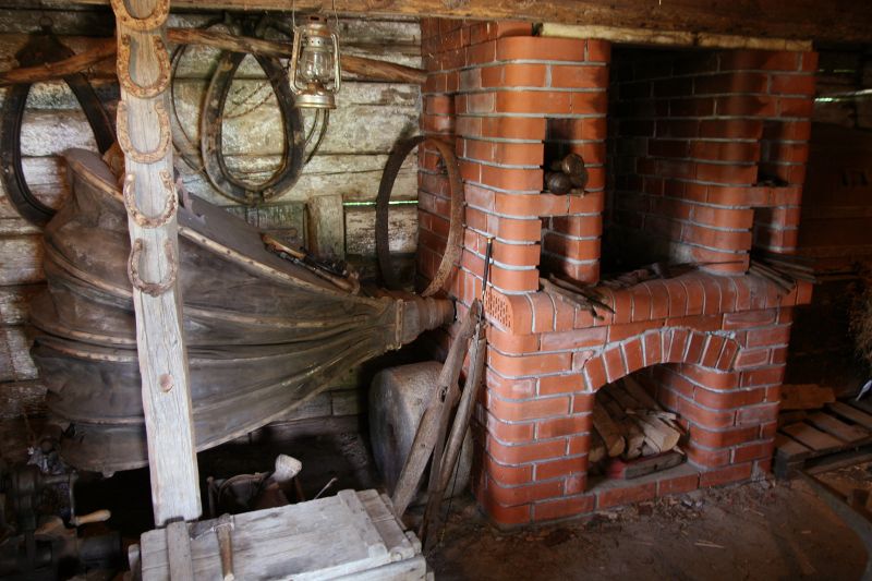 Wnętrze kuźni w gospodarstwie agroturystycznym w Zalipiu. Na zdjęciu widoczny piec kowalski z pustaków i miech kowalski.