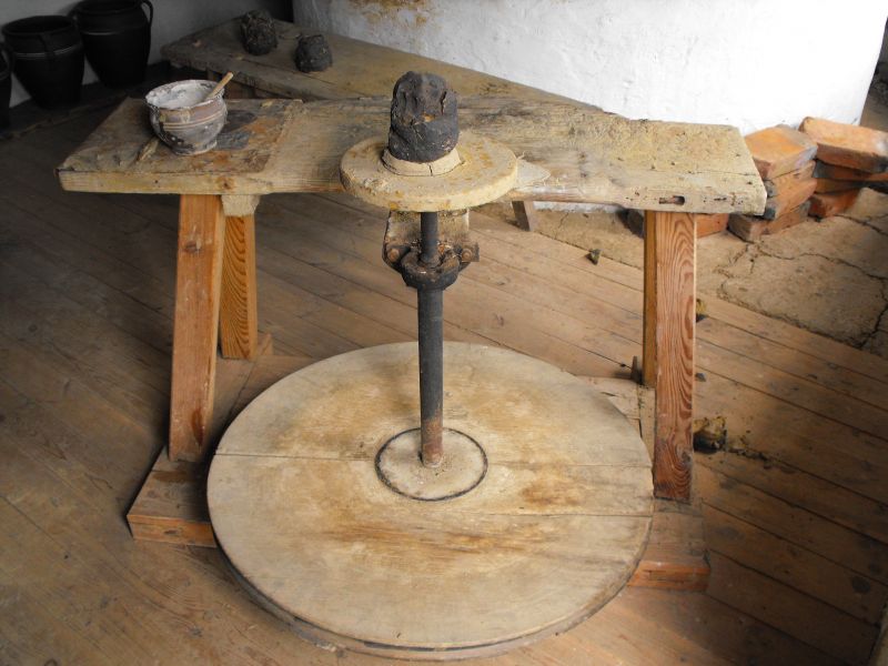 Wnętrze garncarni z Lubienia Kujawskiego. Bezsponowe, nożne koło garncarskie, na nim miska z wodą zwana „moczką”, garnuszek z pobiałką oraz „szyniec” – gładzik i drucik do odcinania naczyń.