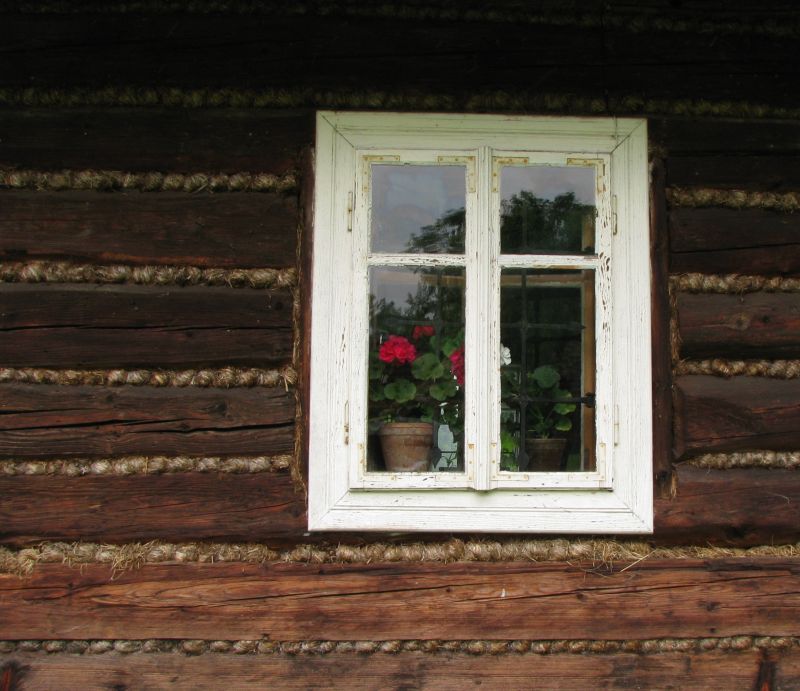Okno pogórzańskiej chałupy ze wsi Gródek. Okno dwuskrzydłowe. Charakterystyczna dla terenów górskich zrębowa konstrukcja ścian uszczelnianych słomą.
