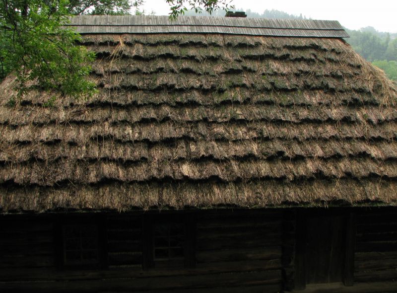 Dach olejarni pogórzańskiej ze wsi Gródek (koło Grybowa). Dach czterospadowy kryty schodkowo słomą. Kalenica zabezpieczona gontem.