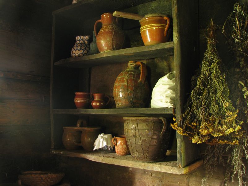 Wnętrze chałupy pogórzańskiej ze wsi Siary. Na zdjęciu gliniane naczynia kuchenne.
