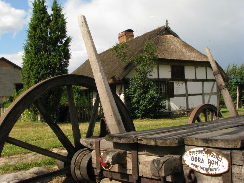 Na pierwszym planie wóz drabiniasty, w głębi chałupa gburska.