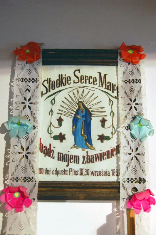 Święty obraz "Słodkie serce Maryi" z początku XX wieku. Na zdjęciu widoczna wycinanka zdobiąca ramę obrazu.