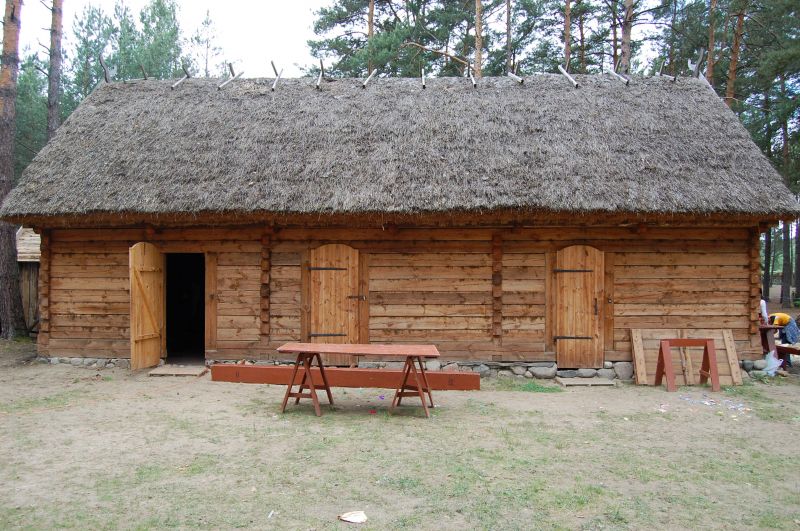 Wpółczesna rekonstrukcja stodoły kurpiowskiej. Dach dwuspadowy z kozłami kryty strzechą.