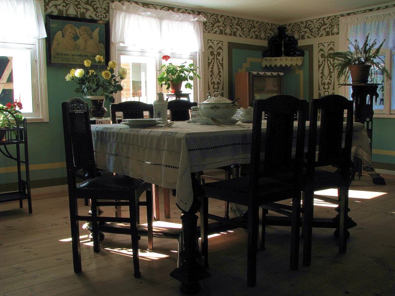 Zagroda Albrechta w Swołowie - wnętrze domu. Na zdjęciu wnętrze pokoju dziennego - stół obiadowy.