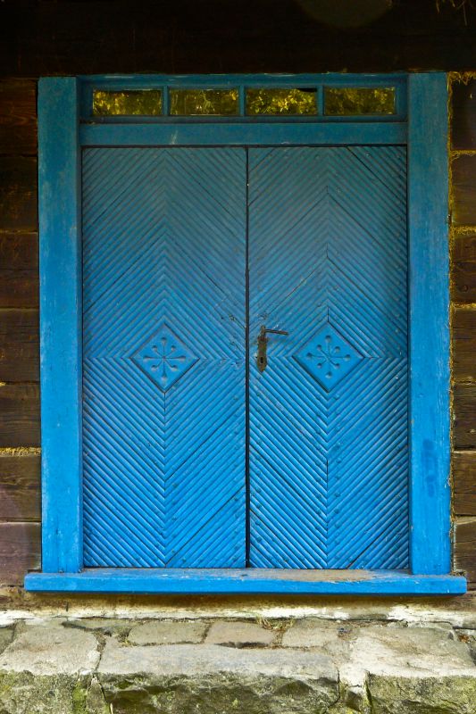 Zdobione, drewniane, drzwi jednej z chałup. Drzwi dwuskrzydłowe zdobione w jodełkę