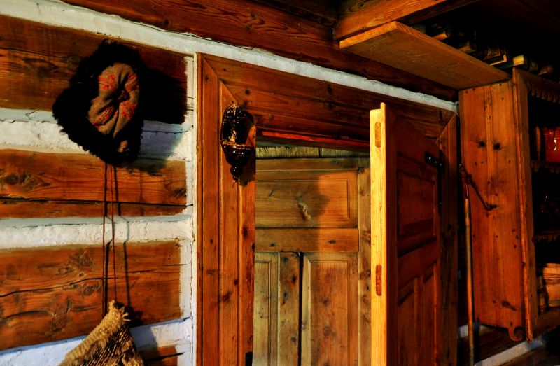 Zagroda Korkoszów w Czarnej Górze. Na zdjęciu podwójne drzwi pomiędzy komorą a sienią. Ściana o konstrukcji zrębowej z wypełnieniem pobielonym wapnem.