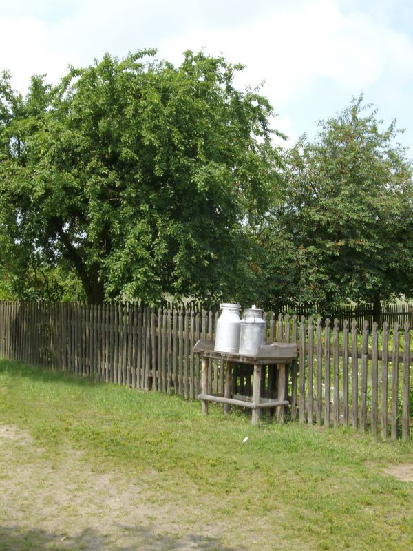 Metalowe bańki na mleko na ławeczce przy płocie sztachetowym.