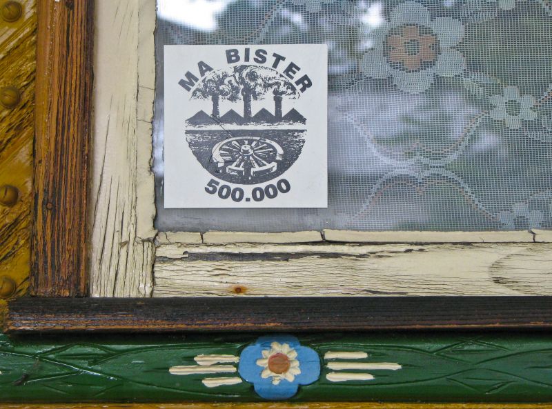 Fragment wozu cygańskiego. Na szybie papierowa nalepka z napisem "Ma Bister 500000" upamiętniająca zagładę Romów podczas II wojny światowej.