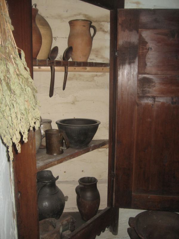 Wnętrze chałupy bogatego chłopa. Gliniane garnki i naczynia wszafie wnękowej świadczą o zamożności rodziny.