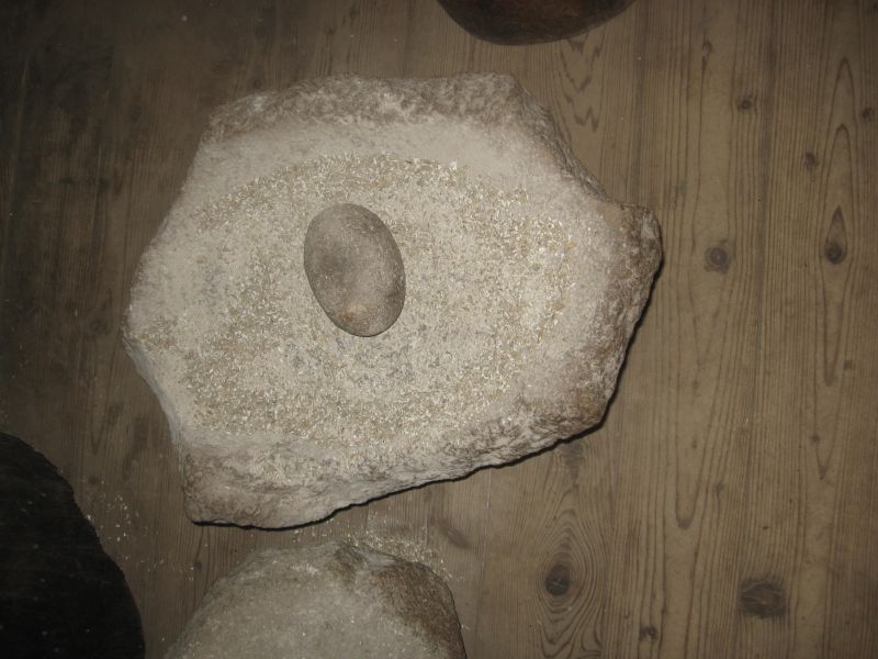 Obiekt wystawiony w ekspozycji „Urządzenia młynarskie, żarna, stępy, miary, wagi”. Kamienne narzędzie do ucierania zboża.