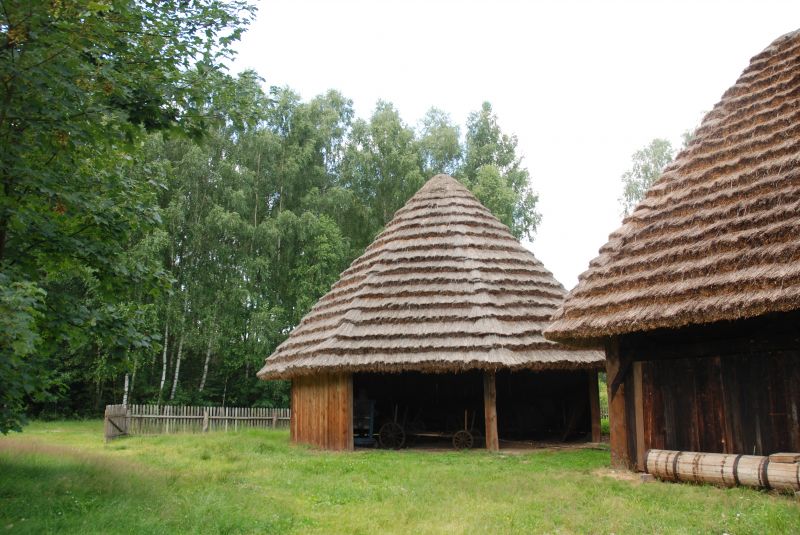 Rzeszowska zagroda Szylarów ze wsi Markowa. Fragment stodoły z przełomu XIX i XX wieku o konstrukcji przysłupowej oraz rekonstrukcja XIX-wiecznej, typowej dla dużych gospodarstw kmiecych szopy kieratowej. Budowla ośmiokątna, kryta stożkowatym dachem ze słomy. W porze letniej chroniła wozy i sprzęt rolniczy przed deszczem, jesienią i zimą pracował w jej wnętrzu kierat konny. |