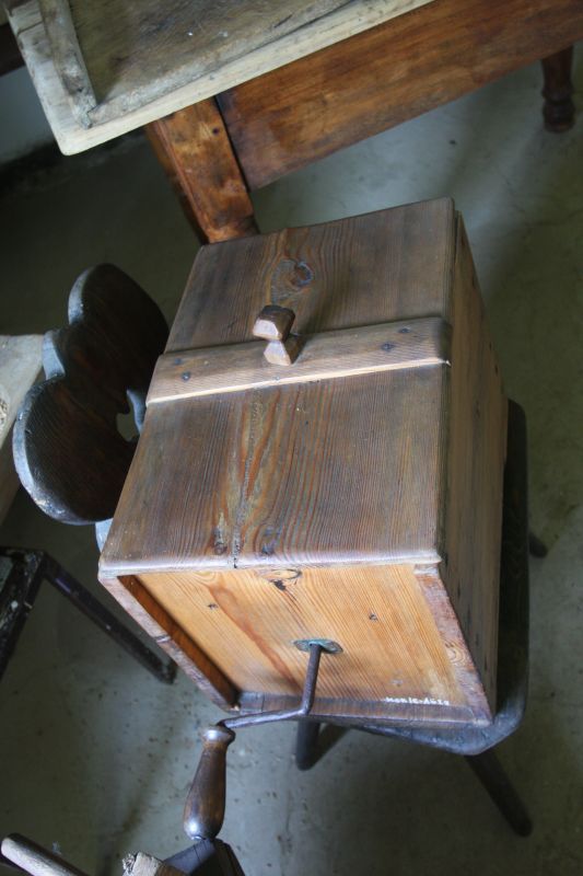 Maselnica skrzynkowa – do przygotowywania większej ilości masła - wchodząca w skład wyposażenia kuchni chałupy ze wsi Kopojno.