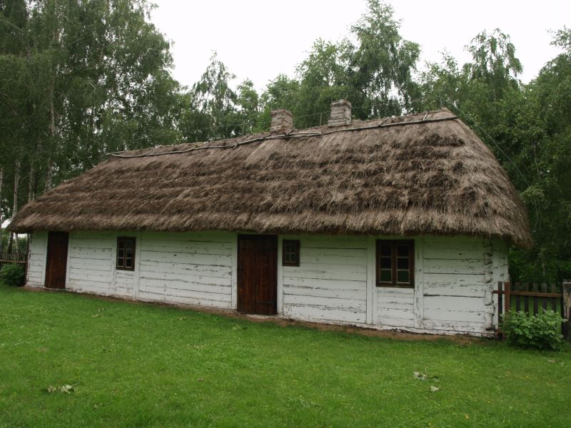 Chałupa szerokofrontowa z miejscowości Sieradz (przystanek kolejowy Sieradz-Męka) z II połowy XIX wieku. Budynek o konstrukcji sumikowo-łątkowej łączonej ze zrębową. Zrąb łączony na węgłach na "rybi ogon" bez ostatków. Dach czterospadowy kryty słomianą strzechą.
