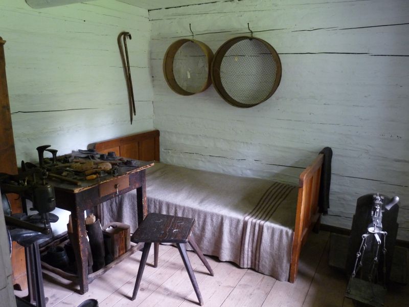 Wnętrze chałupy ze wsi Nowa Łomnica z I połowy XIX wieku. Widoczny warsztat szewski i łóżko.
