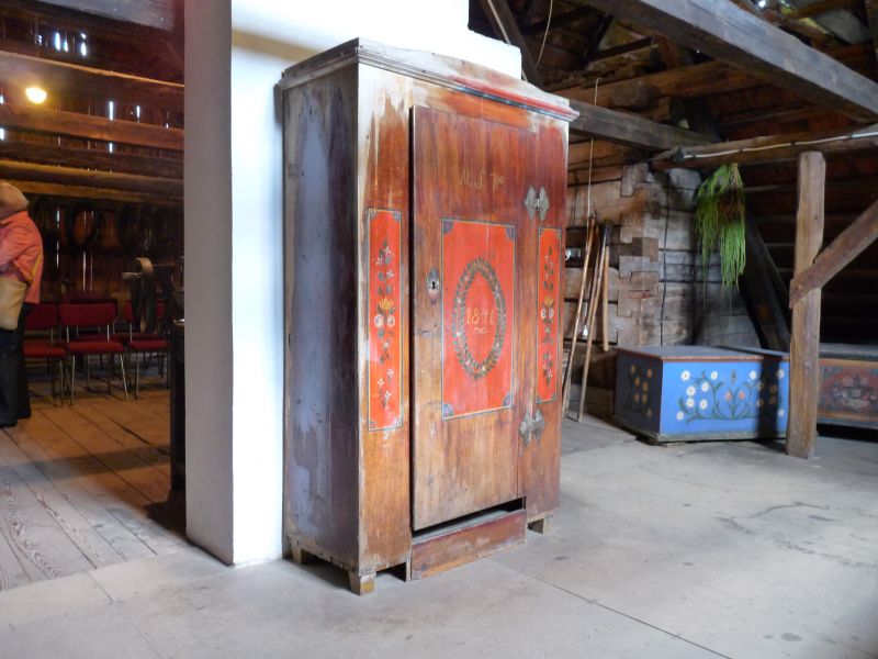 Wnętrze zajazdu. Ręcznie malowana, drewniana szafa z 1871 roku. W tle ozdobnie malowane skrzynie.