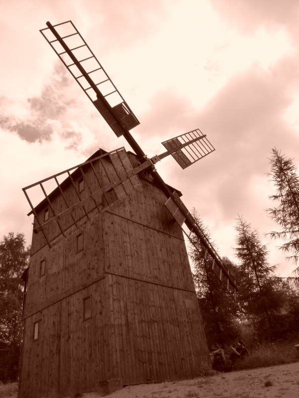 Wiatrak typu „koźlak” ze wsi Jablowo. Budynek trójkondygnacyjny o kostrikcji słupowo-ryglowej, oszalowanej na zewnatrz deskami. Dach trójspadowy o konstrukcji krokwiowo-jętkowej kryty gontem.