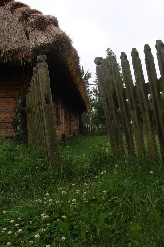 Płot sztachetowy i fragment ściany szczytowej chałupy litewskiej z XIX wieku.
