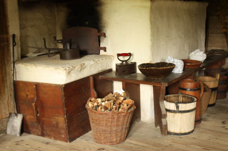 Kuchnia w czarnej izbie chałupy ze wsi Dąbrówka Dolna. Na pierwszym planie piec kuchenny połączony z piecem piekarskim, dookoła którego usytuowana jest ława narożna, a na niej proste naczynia i sprzęty do użytku na co dzień (misy, miski, niecki, korytka), pod ławą wiadra, kotły, balie do mycia, kosze na drewno na opał. |