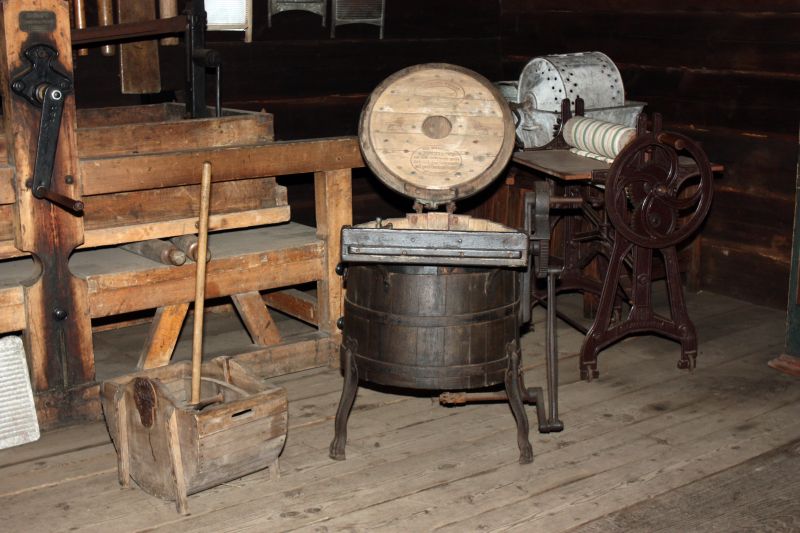 Ekspozycja związana z tkactwem i ubiorami – dawne magielnice i pralki.