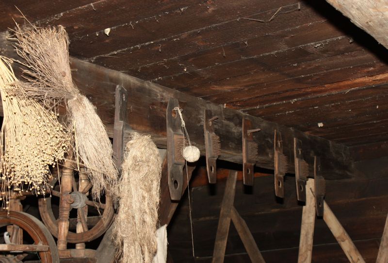 Ekspozycja związana z tkactwem i ubiorami: szczotki do czesania włókien lnianych i konopnych przeznaczonych na wyrób przędzy i kołowrotki.