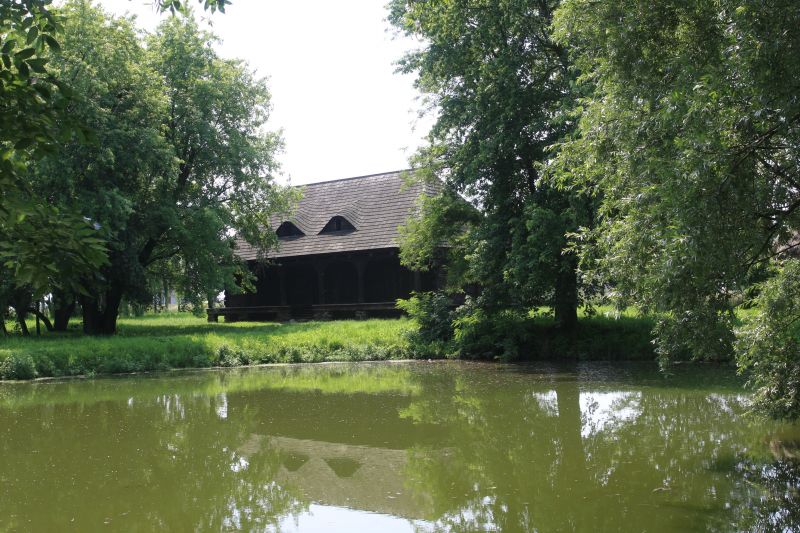 Spichlerz folwarczny z 1800 roku ze wsi Kuźnica Grabowska. Widok zza stawu. Budynek szerokofrontowy z podcieniem. Dach czterospadowy kryty gontem.