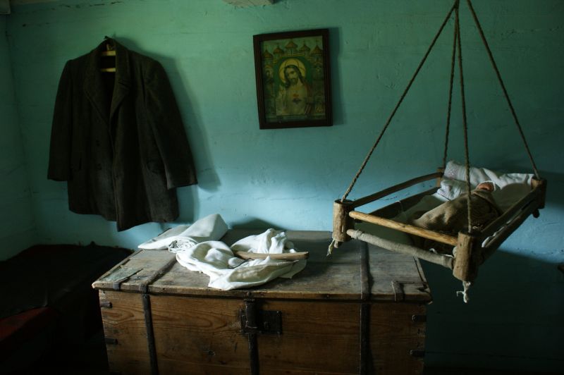 Izba mieszkalna w chałupie ze wsi Stara Grzybowszczyzna z XIX wieku. Przykład budownictwa charakterystycznego dla niezamożnych mieszkańców wsi. Na zdjęciu widoczna drewniana skrzynia z metalowymi okuciami, zawieszona pod sufitem kołyska dla dziecka, święty obraz i męski płaszcz.