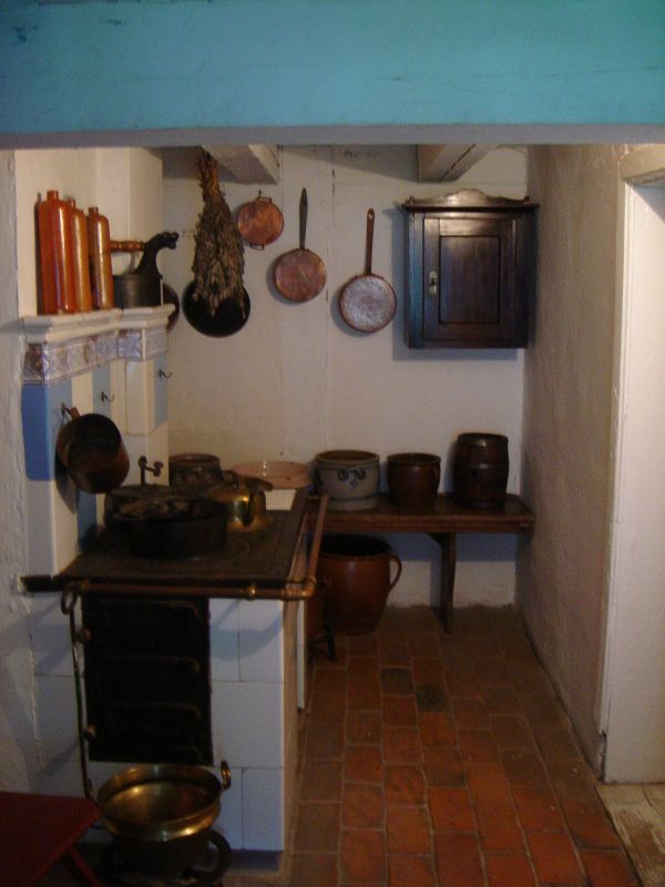 Wnętrze chałupy rybackiej ze wsi Dąbki pod Koszalinem z 1869 roku. Wnętrze kuchni. Kuchnia z paleniskiem zamkniętym pod płytą.