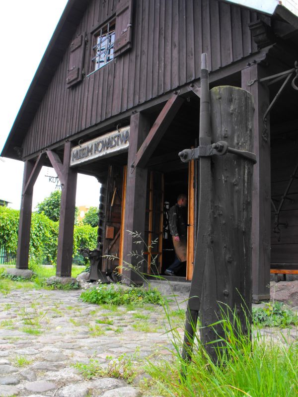 Gwintownik – urządzenie do wycinania gwintów wewnątrz piasty koła. Gotową piastę nakręcano na gwintownik dociskając ją dużą siłą do dołu. Gwint był wyżynany na zimno (tj. metal nie był rozgrzany) wewnątrz piasty. W tle widoczny front kuźni. Kuźnia o konstrukcji zrębowej z podcieniem od frontu.
