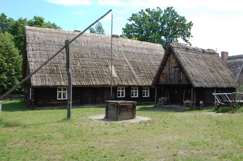 Wielobudynkowa zagroda ze wsi Krobielowo (Zachodnia Wielkopolska) zbudowana na planie czworoboku. Od lewej: studnia z żurawiem, chałupa bogatego gospodarza pochodząca z 1803 roku i podcieniowy spichlerz z 1823 roku. Oba budynki mają dachy dwuspadowe, krokwiowo - jętkowe i są kryte strzechami słomianymi. |