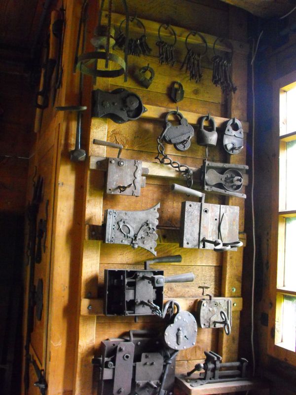 Wnętrze kuźni. Kolekcja zdobionych zamków, kłódek i kluczy.