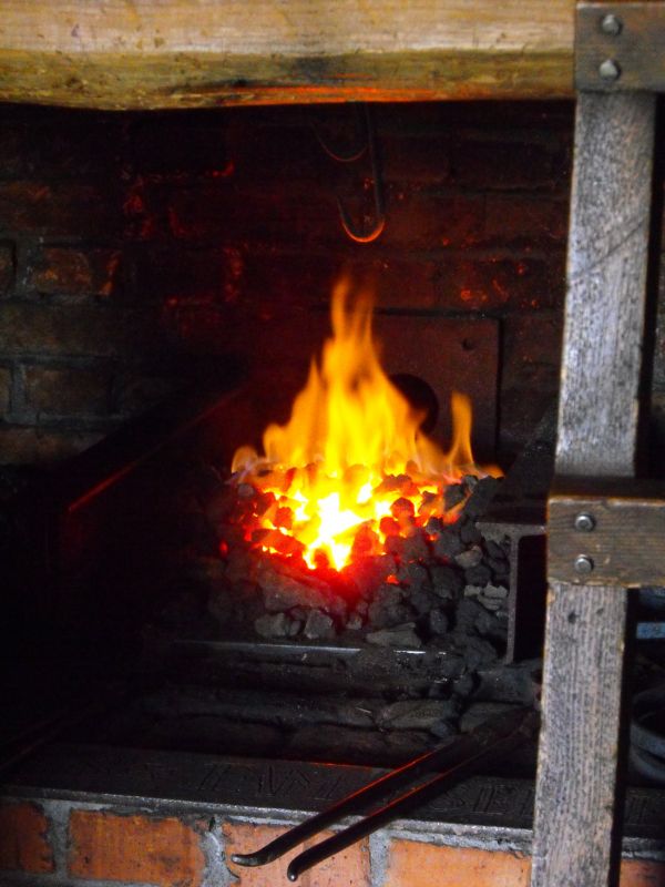 Palenisko w kuźni. Na jego skraju leżą kleszcze.