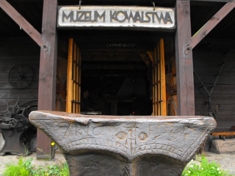 Kowadło bezdroże. Nazwa pochodzi od braku charakterystycznego elementu w kształcie rogu, na którym można giąć metal. Kowadło jest stare, zostało wykonane jeszcze w XIX wieku. Wcześniej należało prawdopodobnie do niemieckiego kowala. W tle wejście do kuźni.