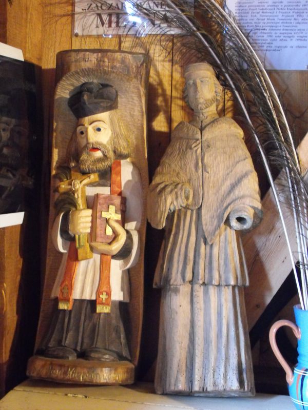 Ekspozycja w budynku młyna. Rzeźby św. Jana Nepomucena. Św. Jan Nepomucen, patron mostów i przepraw, w kulturze ludowej chronił również przed powodzią i innymi zagrożeniami wodnymi. Jego figury ustawiano przy miejscach, nad którymi miał trzymać pieczę. Wiele figur świętego ustawiano nad Pilicą i jej dopływami. |