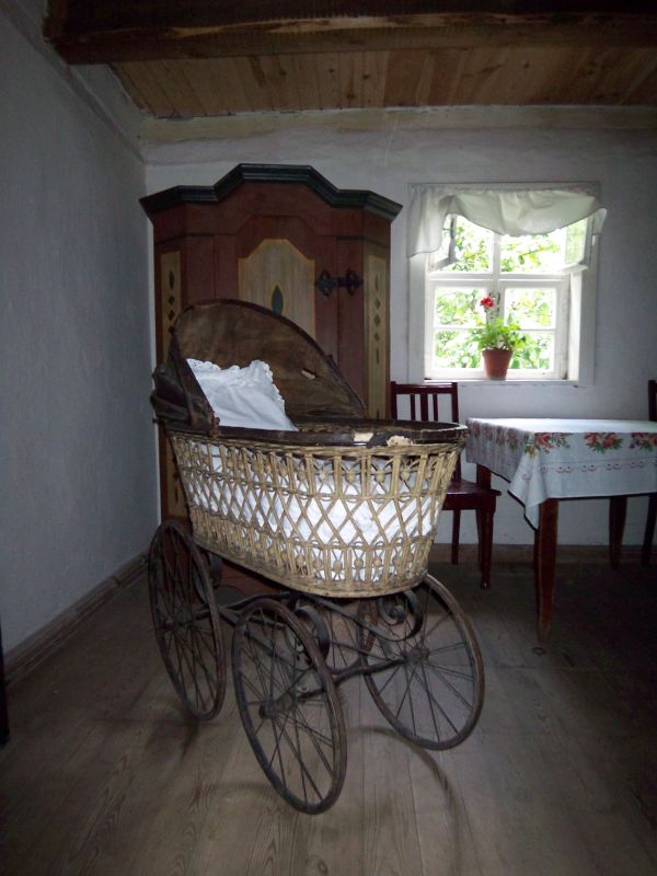 Wiklinowy wózek dziecięcy.