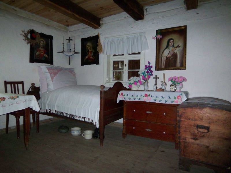 Izba w budynku karczmy ze wsi Solec Nowy. Na zdjęciu łóżko a pod nim zestaw nocników, komoda, drewniana skrzynia i święte obrazy na ścianach. Wyposażenie z karczmy w części jest oryginalne, w części natomiast przeniesione ze wsi Zbąszyń.