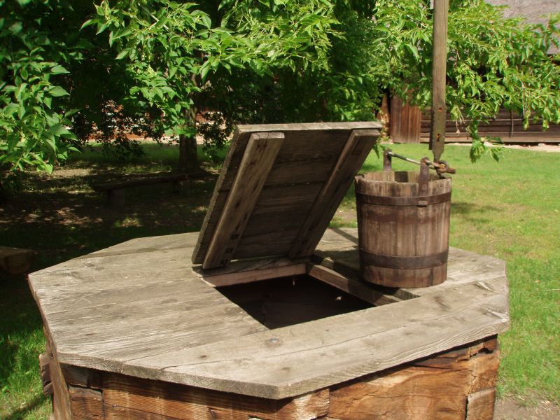 Studnia ośmiokątna z żurawiem z XVIII wieku. Element zagrody karczmarza. Studnia drewniana o konstrukcji zrębowej.