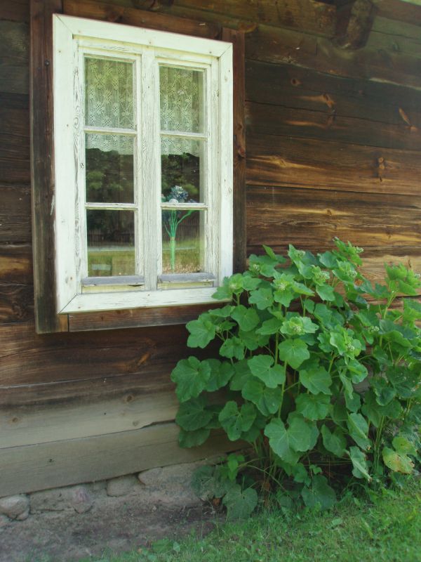Okno chałupy ze wsi Świętno z 1802 roku. Okno dwuskrzydłowe Budynek na ceglano-kamiennym fundamencie.