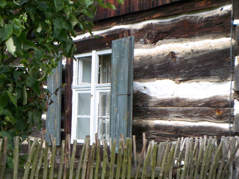 Okno chałupy ze wsi Reklinek z II połowy XIX wieku. Okno z drewnianymi okiennicami w kolorze błękitnym. Budynek o konstrukcji zrębowej z wypełnieniami zrębu malowanymi wapnem na biało.