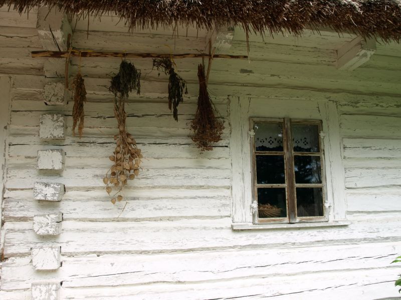 Fragment chałupy ze wsi Płaza z końca XIX wieku. Okno dwuskrzydłowe. Budynek o konstrukcji zrębowej z węgłami łączonymi na "obłap". Ściany pobielone wapnem. Pod okapem suszą się zioła.