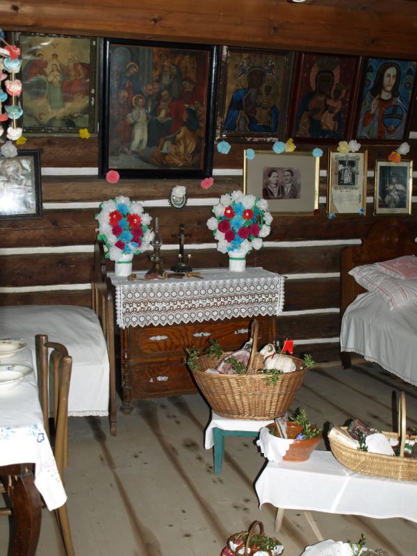 Wnętrze chałupy ze wsi Podolsze z 1862 roku. Wyposażenie z I połowy XIX wieku. Fragment wnętrza z wystawą pokazująca wystrój związany z Wielkanocą. Na zdjęciu widoczne koszyki ze święconką, święte obrazy i przystrojenie izby kwiatami z bibuły. Podłoga z desek.