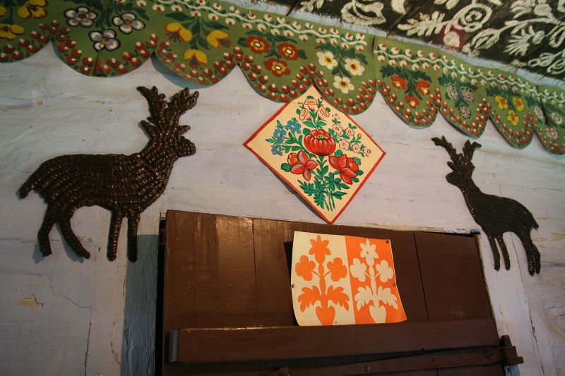 Detale zdobnicze w sieni chałupy Felicji Curyłowej: jelenie zszywane z łusek szyszek sosny, wycinanka "negatyw-pozytyw", Malowany "szlaczek" u sufitu.