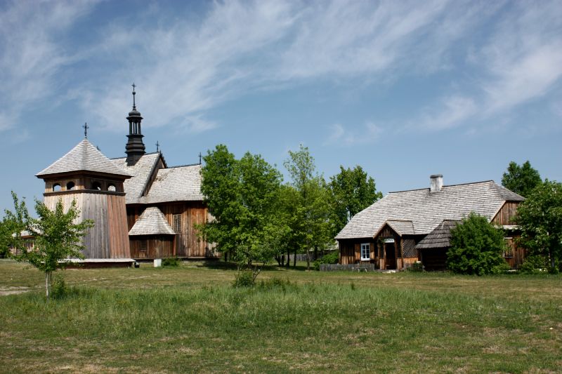 Komplet zabytków architektury sakralnej w zespole budownictwa małomiasteczkowego. Na zdjęciu widoczne: barokowy kościół ze wsi Rogowo, dzwonnica ze wsi Kazimierza Wielka i organistówka ze wsi Bieliny.