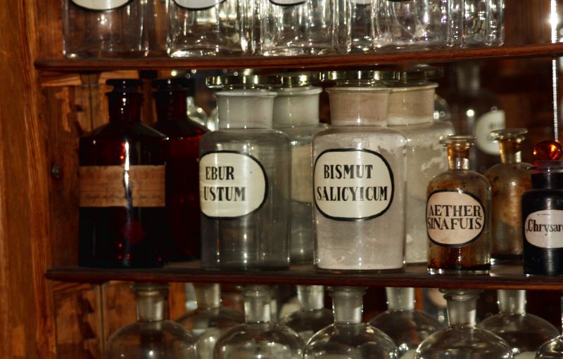 Aranżacja apteki z przełomu XIX i XX wieku. Meble apteczne z nieistniejącej już apteki ze wsi Busko-Zdrój. Na półkach kolekcja flakonów i słojów, w których przechowywane były leki.