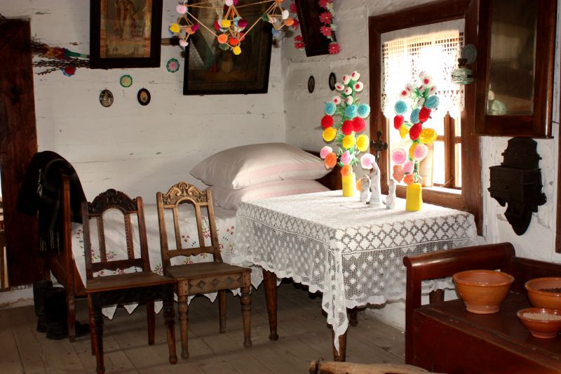 Wnętrze chałupy zamożnego gospodarza ze wsi Rokitno z 1805 roku. Izba główna. Na stole stoją kwiaty z bibuły, a z sufitu zwisa "pająk".
